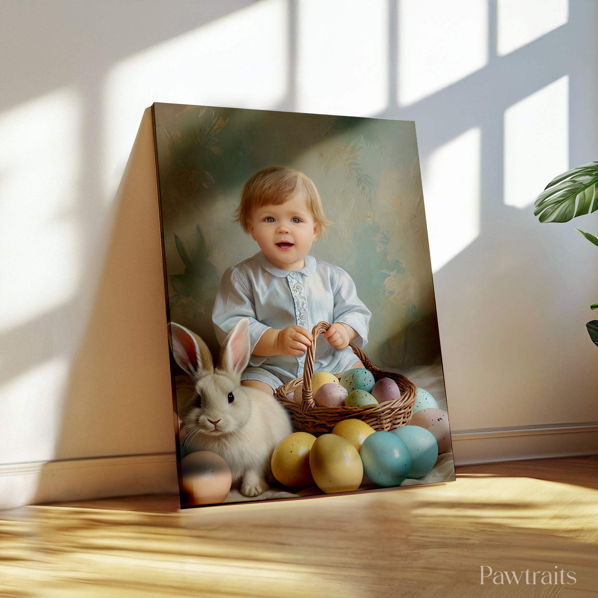 Нежен и топол велигденски стил со кошничка и шарени јајца, создаден за да ја претвори фотографијата на Вашето дете во уникатен спомен на платно.